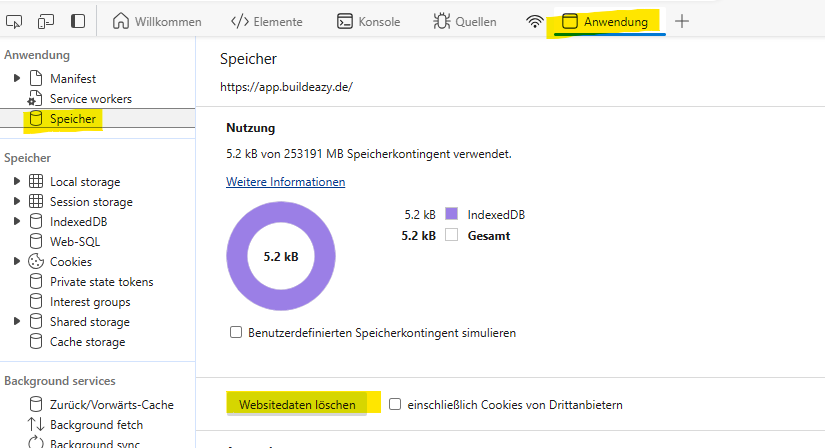 - In der Konsole dann im Tab "App" (im Edge auch Anwendung) - Links auf Speicher klicken und dort dann auf "Websitedaten löschen" klicken
